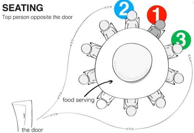 «Танец» начинается уже с порога: люди мягко подталкивают друг друга к определённым местам, стараясь проявить скромность и уважение. Самое почётное место — напротив двери; второе по значимости — справа от него, третье — слева. Не садитесь туда, если вас не пригласили. Подыграйте ситуации: немного сопротивляйтесь, делайте вид, что уступаете.